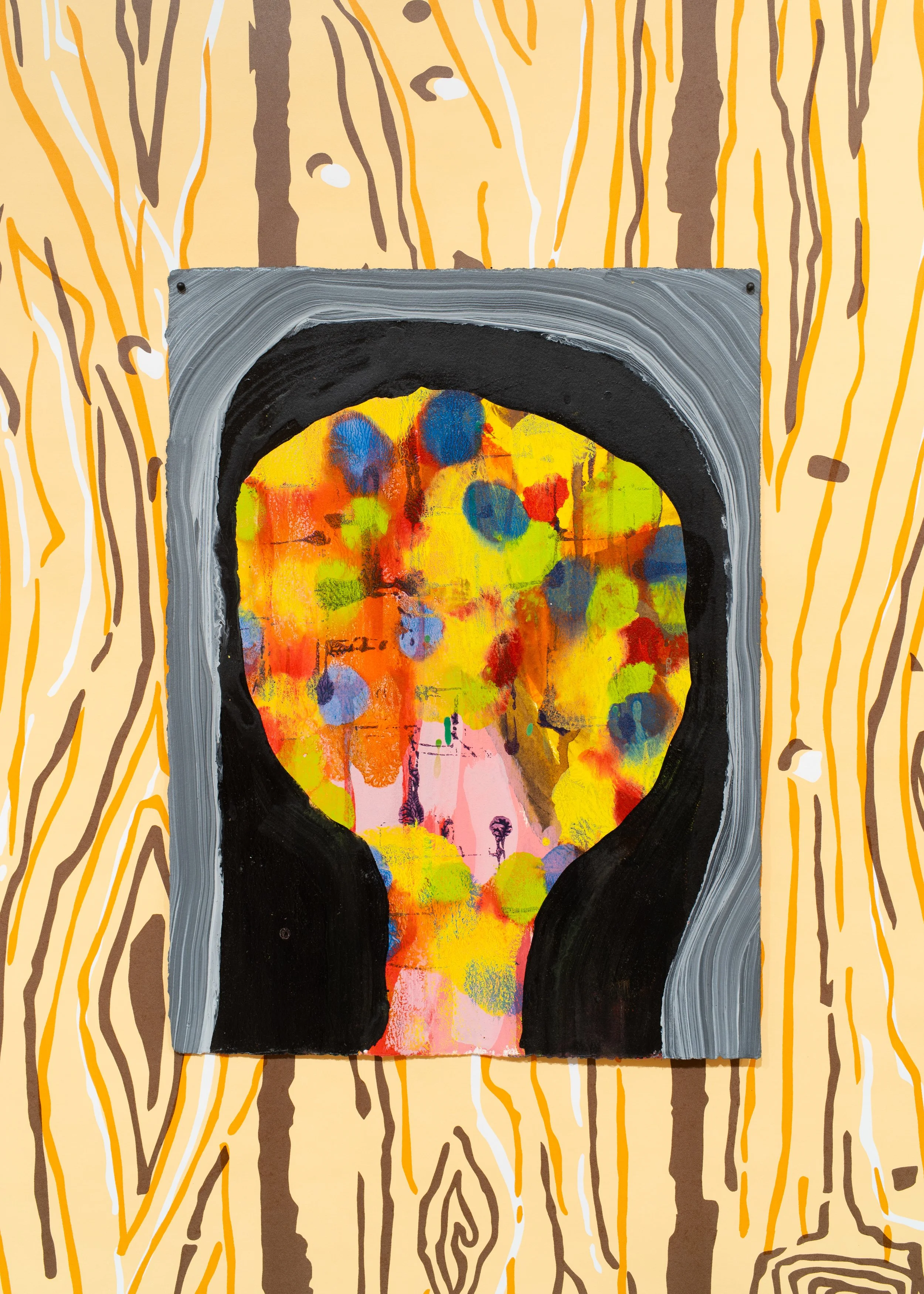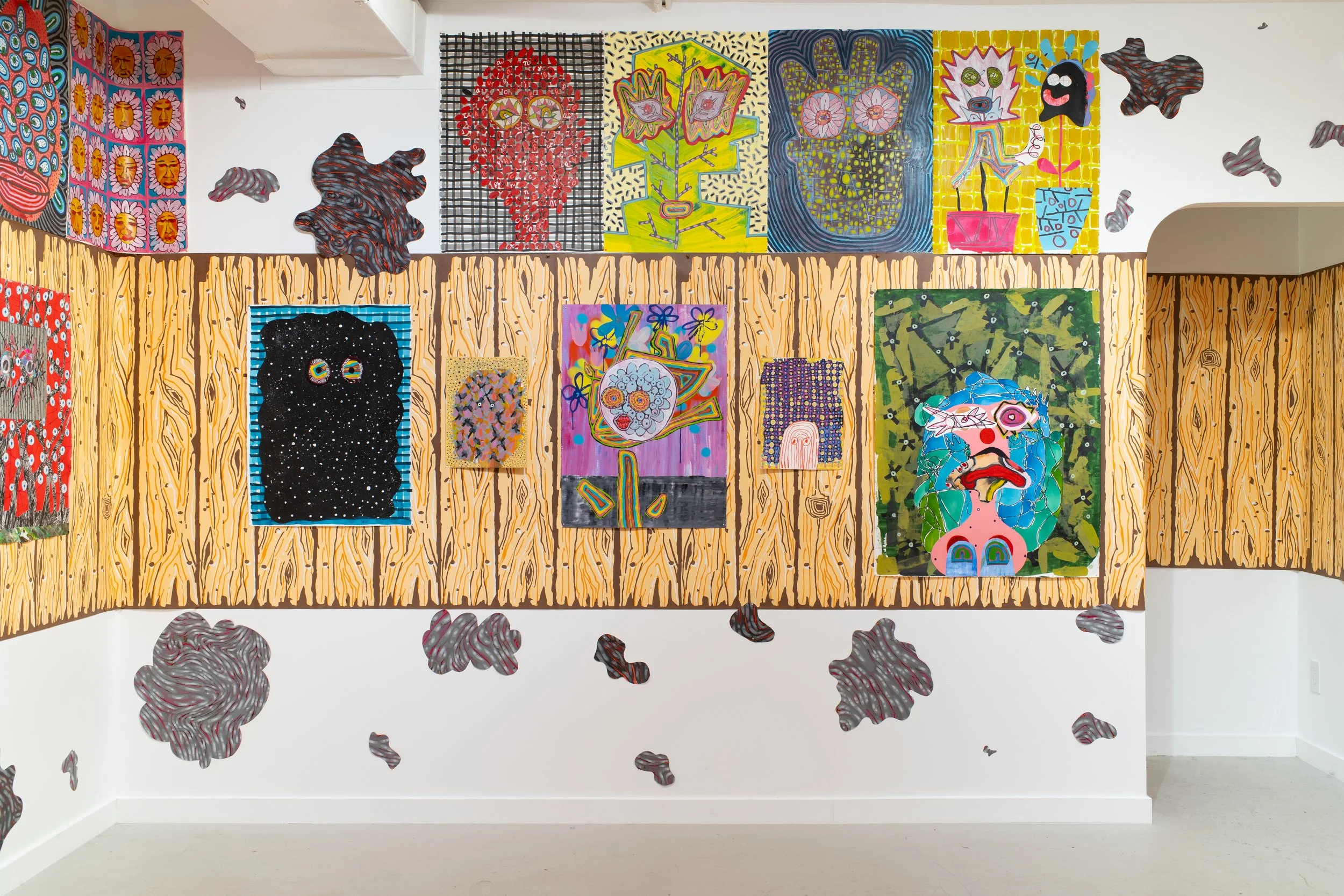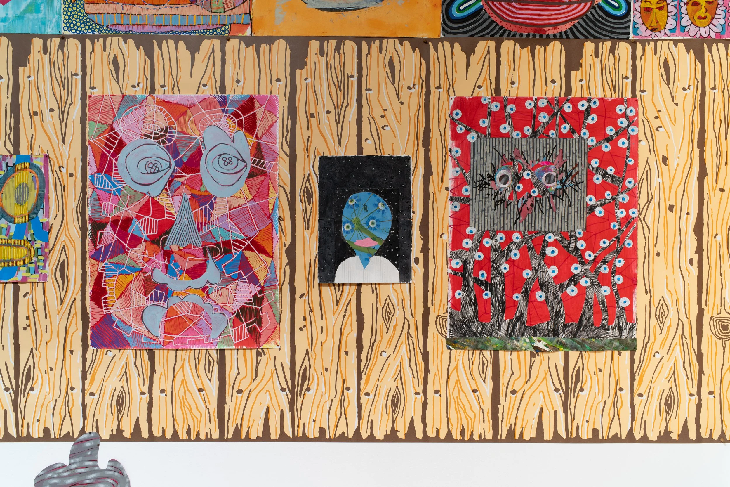 As the artists lay down visual "riffs" for one another to respond to, figures and forms mutate into aggressively psychedelic images that are comic yet eerie. Having accumulated hundreds of paintings on paper, Hamlett and Tad cannibalize their paintings into new, "exquisite corpse"-like collages. The paintings in Rainbow Trees are new works that contain fragments of past works, representing a celebratory pause in the ongoing, collaborative cycle of Mellow Mountain Coalition.